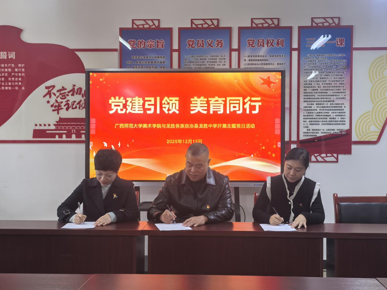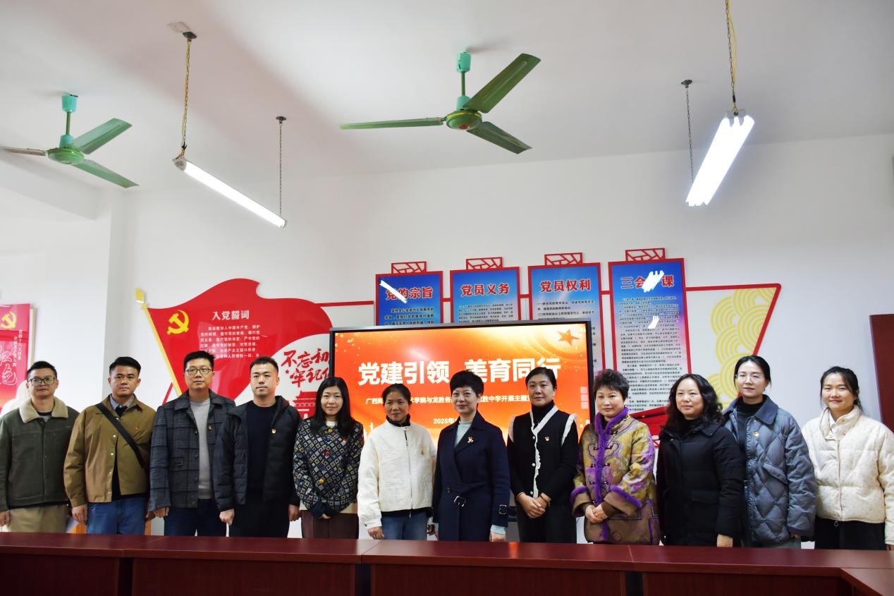 為深入落實(shí)黨的二十大關(guān)于建設(shè)教育強(qiáng)國(guó)、推進(jìn)文化自信自強(qiáng)的重要部署,積極探索新時(shí)代“黨建+美育”融合育人新路徑,12月12日,廣西師范大學(xué)美術(shù)學(xué)院教工第二黨支部、廣西師范大學(xué)附屬中學(xué)第一黨支部與龍勝中學(xué)黨委聯(lián)合舉辦“黨建引領(lǐng) 美育同行”聯(lián)學(xué)共建主題黨日活動(dòng)。此次跨學(xué)段、跨區(qū)域黨建聯(lián)動(dòng),以組織共建、資源共享、發(fā)展共謀為抓手,推動(dòng)黨建工作與教育教學(xué)、美育實(shí)踐深度融合,構(gòu)筑城鄉(xiāng)教育協(xié)同發(fā)展新平臺(tái)。
